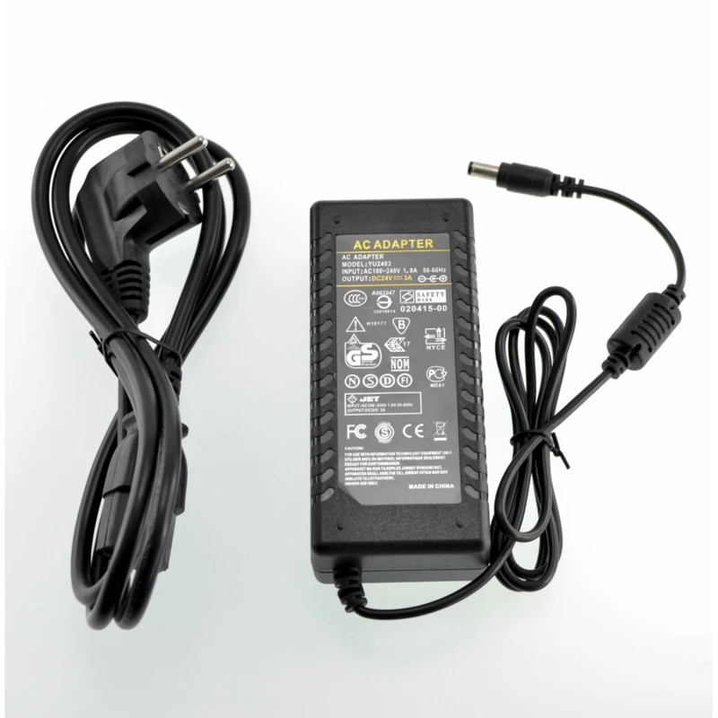 This power supply can run longer LED strips or high-consumption monitors thanks to its 72W output (24V x 3A). The standard 5.5 mm connector makes integration easy. Compared with lower-amp supplies, it can handle more load without overheating. However, for larger loads a higher-capacity model is required.