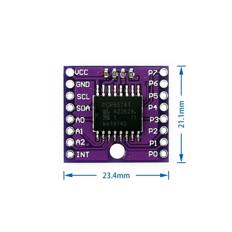 El mòdul està compost principalment per una PCB de fibra de vidre (FR4), pins de llautó banyats i el xip PCF8574T encapsulat en plàstic. Les seves dimensions típiques són 40 mm x 20 mm x 14 mm i el pes aproximat és de 7 g.