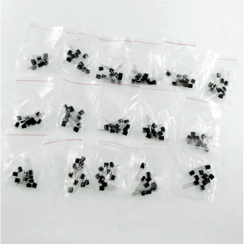 Include 16 modelli diversi di transistor TO92, con 10 unità per ogni modello, come S9012, S9013, S9014, S9015, S9018, A1015, C1815, S8550, S8050, 2N3904, 2N3906, 2N5551, 2N5401, A42, A92 e A733.