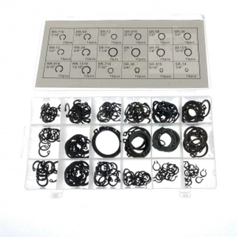 Include 225 anelli Seeger in 18 misure diverse, ordinati in una scatola di plastica per facilitarne la conservazione.