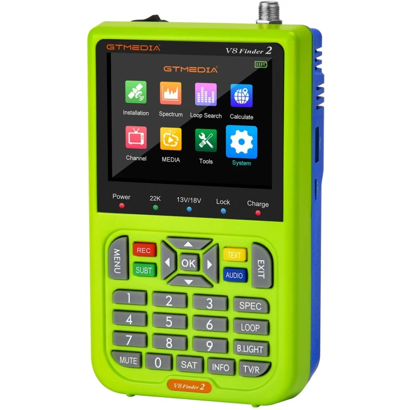The V8 Finder provides digital signal measurement, display on a 3.5-inch LCD screen, support for DVB-S/S2 HD and advanced functions such as MPEG-2/4 decoding, channel editing and USB software updates. This allows faster and more accurate satellite dish alignment than analogue models, which usually show only a simple signal level without quality analysis.